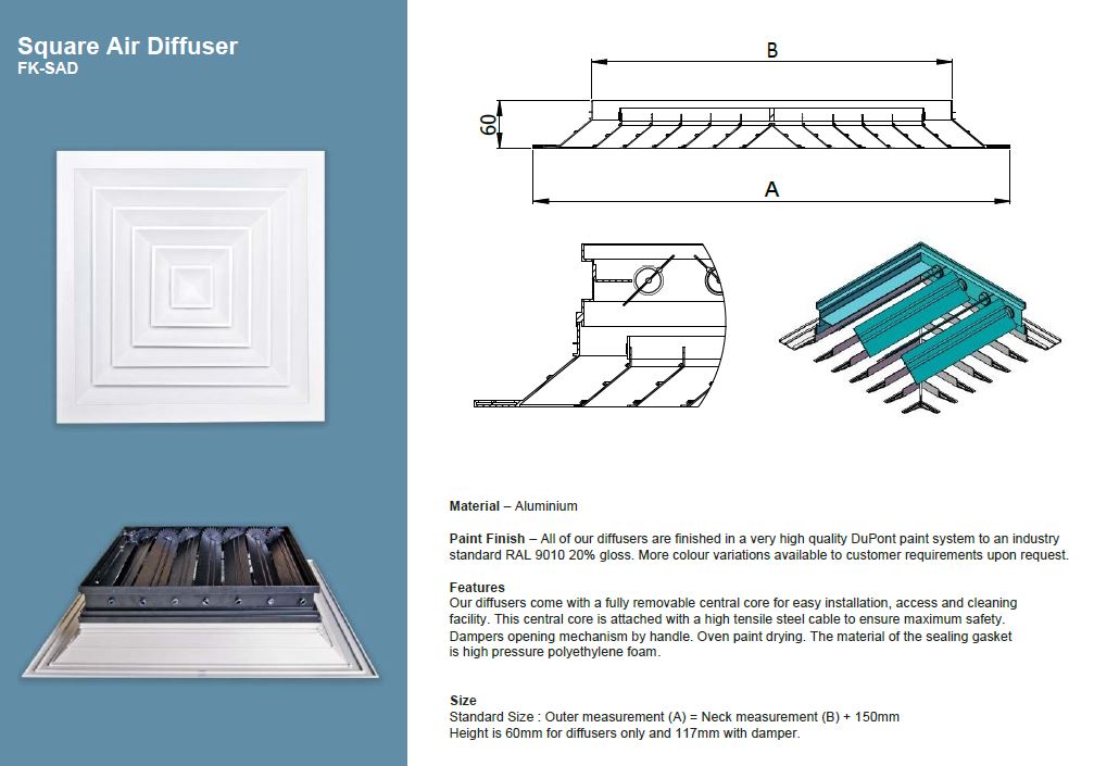 Con dimensiones de 40×40 cm, su estructura de aluminio garantiza durabilidad y resistencia, convirtiéndolo en una opción ideal para sistemas de ventilación. El modelo FK-SAD permite una distribución eficiente del aire, mejorando la circulación y el confort en habitaciones, oficinas o locales comerciales.
